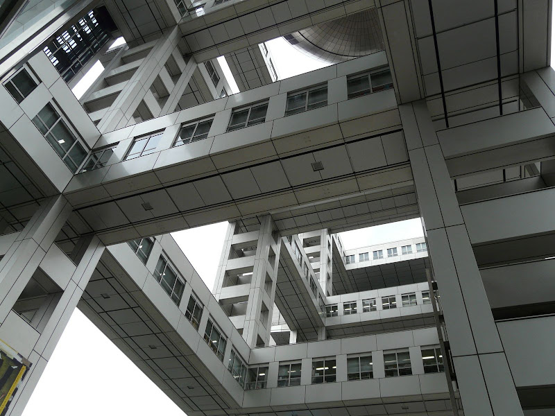 En Odaiba, destaca el edificio de Fuji TV, muy curiosa por sus pasillos al aire y su enorme bola en un lateral donde se graban diferentes programas de TV: